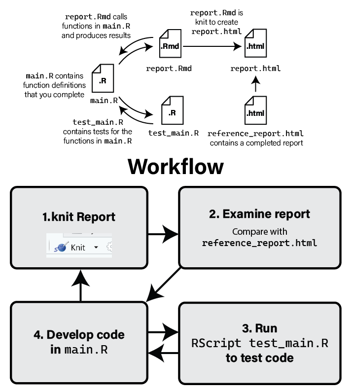Each assignment has a similar format and follows a similar workflow. The following figure describes how the files in the repos interact.