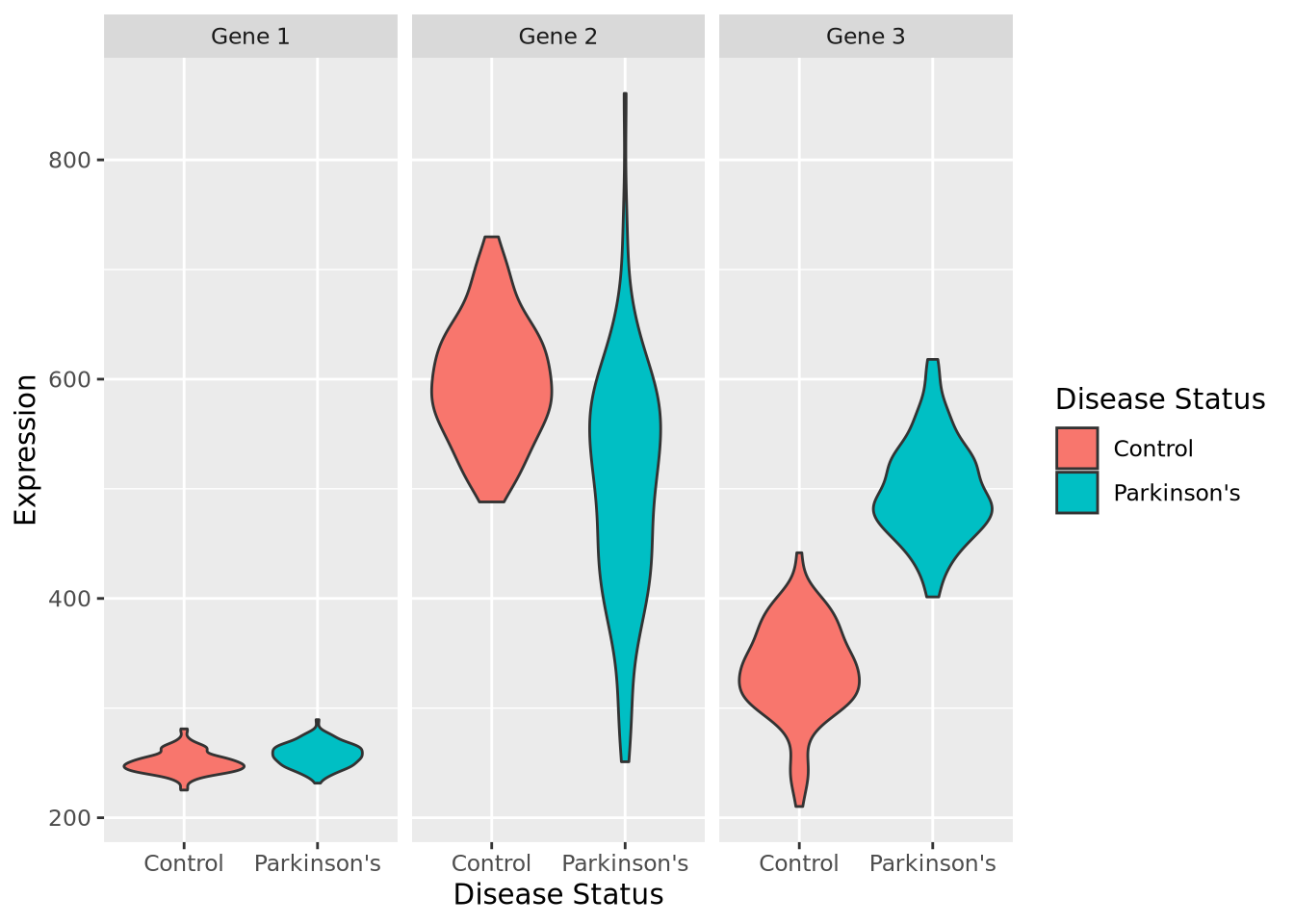 By inspection, it appears that Gene 1 has no relationship with disease; we may safely eliminate this gene from further consideration. Gene 2 appears to have a different profile depending on disease status, where control individuals have a higher average expression and a lower variance. Unfortunately, despite this qualitative difference, this gene may not be useful for telling whether someone has disease or not - the ranges completely overlap. Gene 3 appears to discriminate between disease and control. There is some overlap in the two expression distributions, but above a certain expression value these data suggest a high degree of predictive accuracy may be obtained with this gene. Measuring this gene may therefore be useful, if the results from this dataset generalize to all people with Parkinson’s Disease.