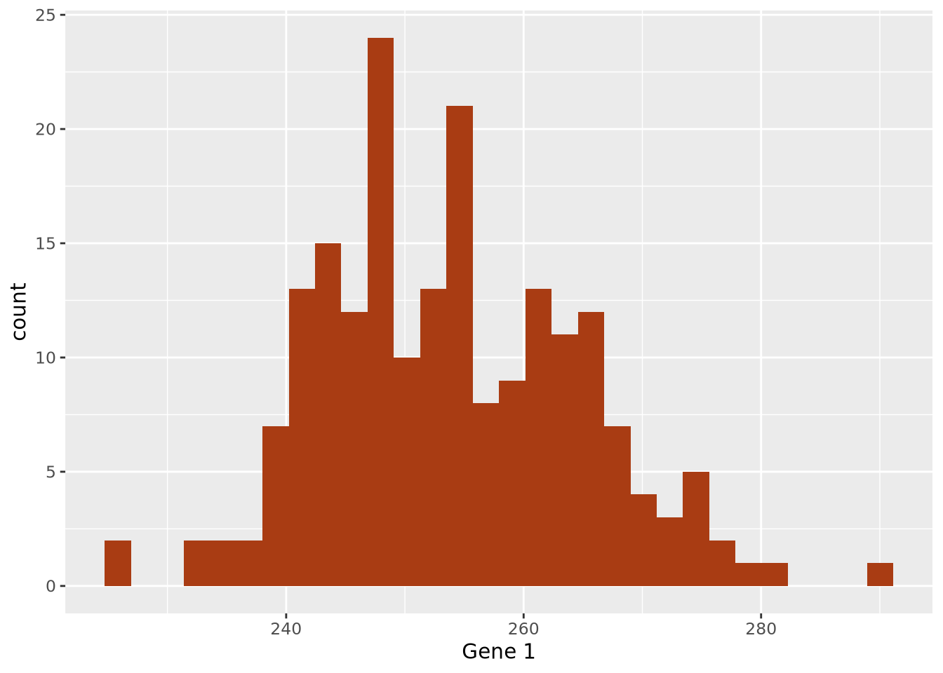 Broadly speaking, data summarization is the process of finding a lower-dimensional representation of a larger dataset. There are many ways to summarize a set of data; each approach will emphasize different aspects of the dataset, and have varying degrees of accuracy. Consider the gene expression of Gene 1 for all individuals in our example above, plotted as a distribution with a histogram:
