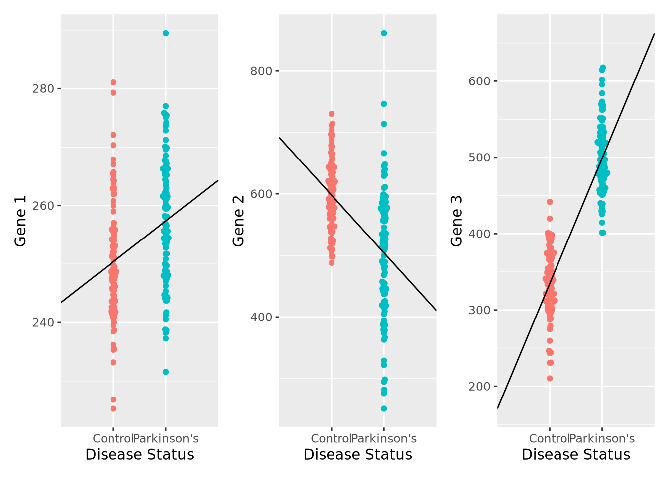 As an example, let’s consider a scenario where we wish to assess whether any of three genes can help us distinguish between patients who have Parkinson’s Disease and those who don’t by measuring the relative activity of those genes in blood samples. We have the following made-up dataset: