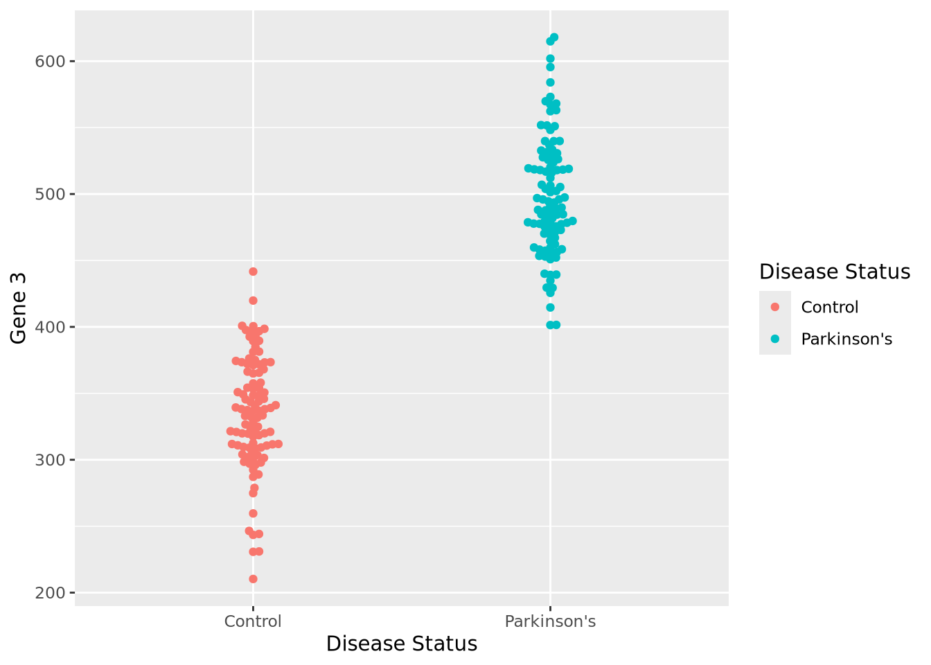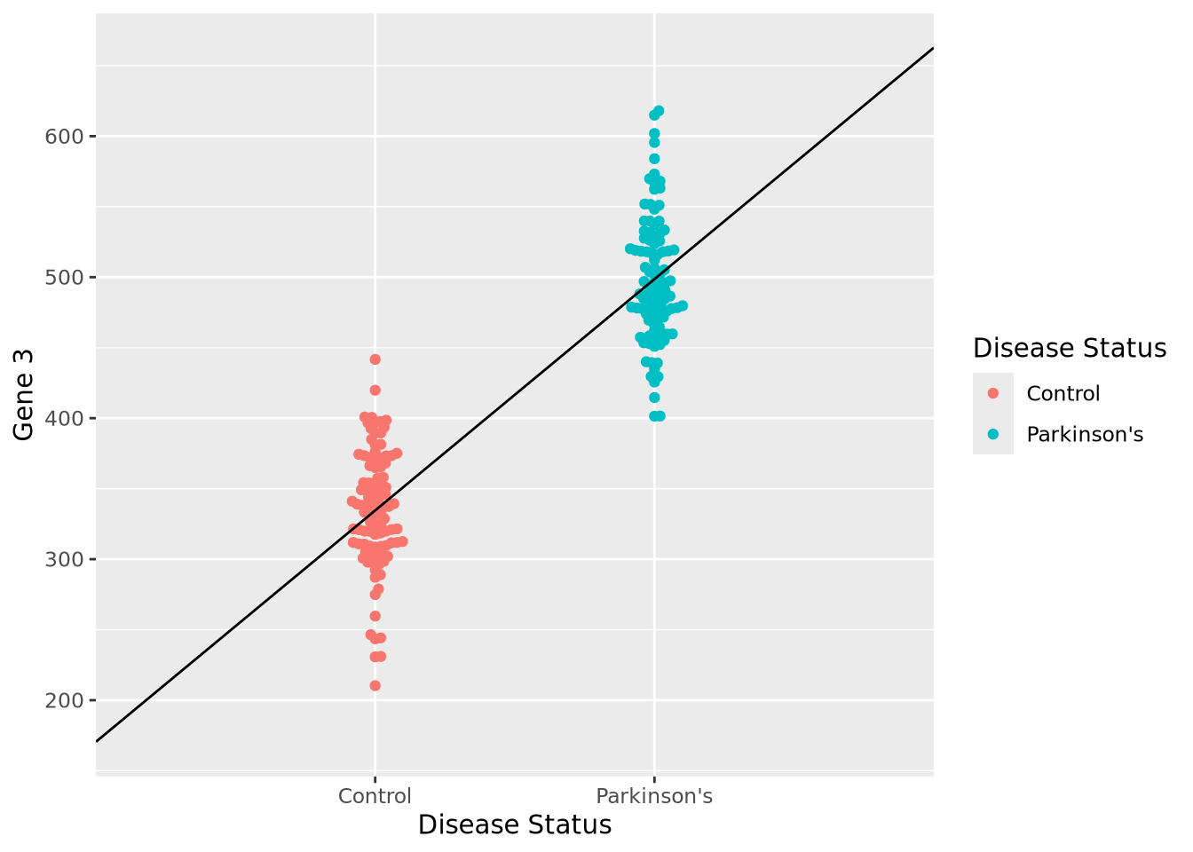 Another way to pose this prediction question is in the opposite (and arguably more useful) direction: if all we knew about a person was their Gene 3 gene expression, how likely is it that the person has Parkinson’s Disease? If this gene expression is predictive enough of a person’s disease status, it may be a viable biomarker of disease and thus might be useful in a clinical setting, for example when identifying presymptomatic individuals or assessing the efficacy of a pharmacological treatment.