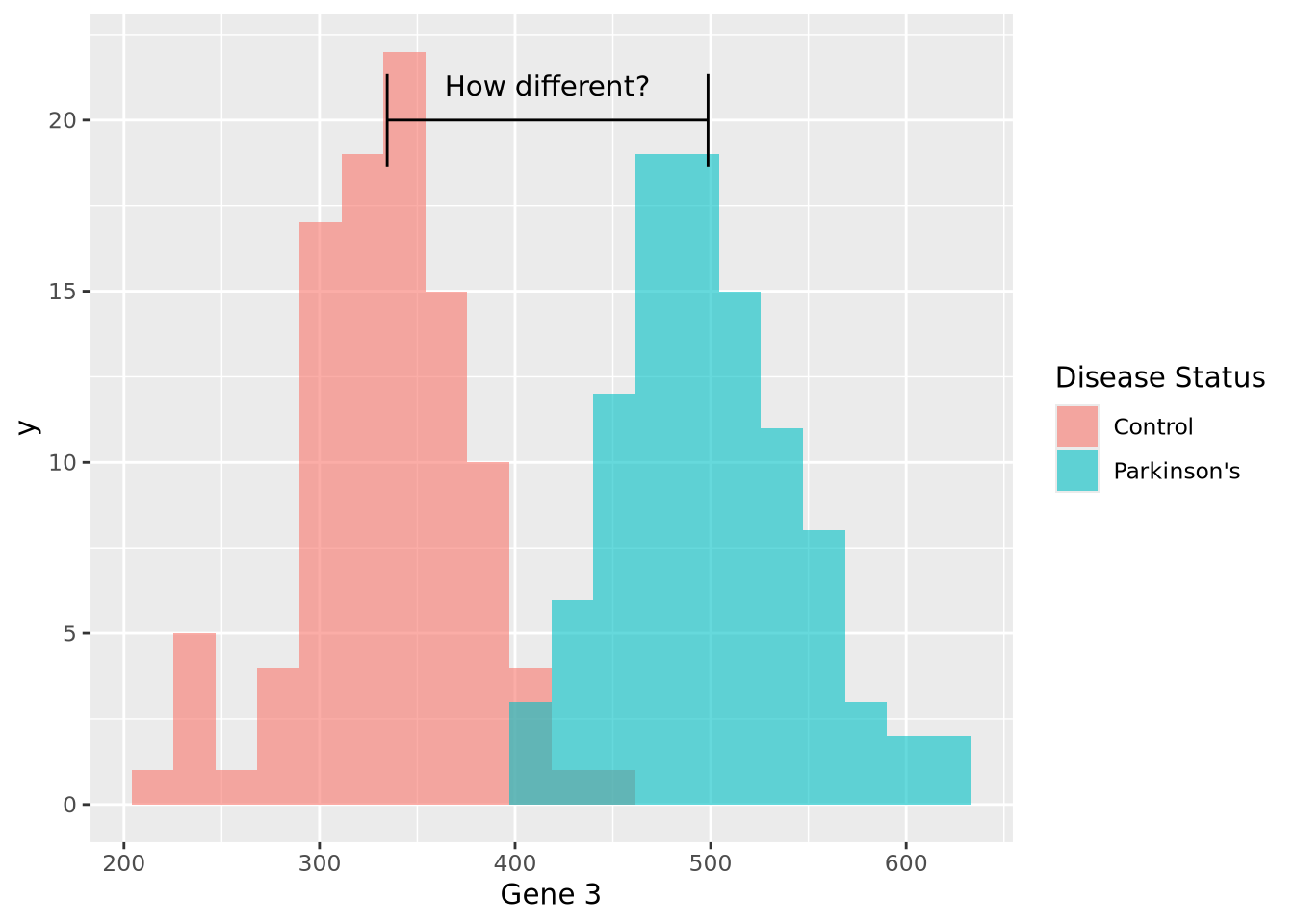 So far, we have not done any modeling, but instead relied on plotting and our eyes. A more quantitative question might be: how much higher is Gene 3 expression in Parkinson’s Disease than control? Another way of posing this question is: if I know a patient has Parkinson’s Disease, what Gene 3 expression value do I expect them to have? Written this way, we have turned our question into a prediction problem: if we only had information that a patient had Parkinson’s Disease, what is the predicted expression value of their Gene 3?