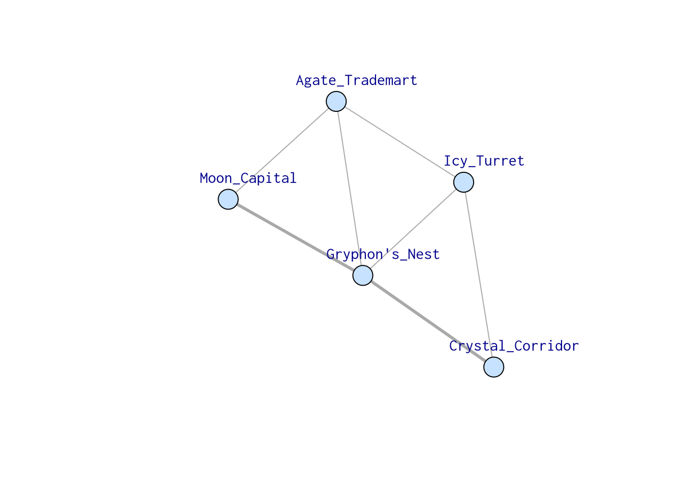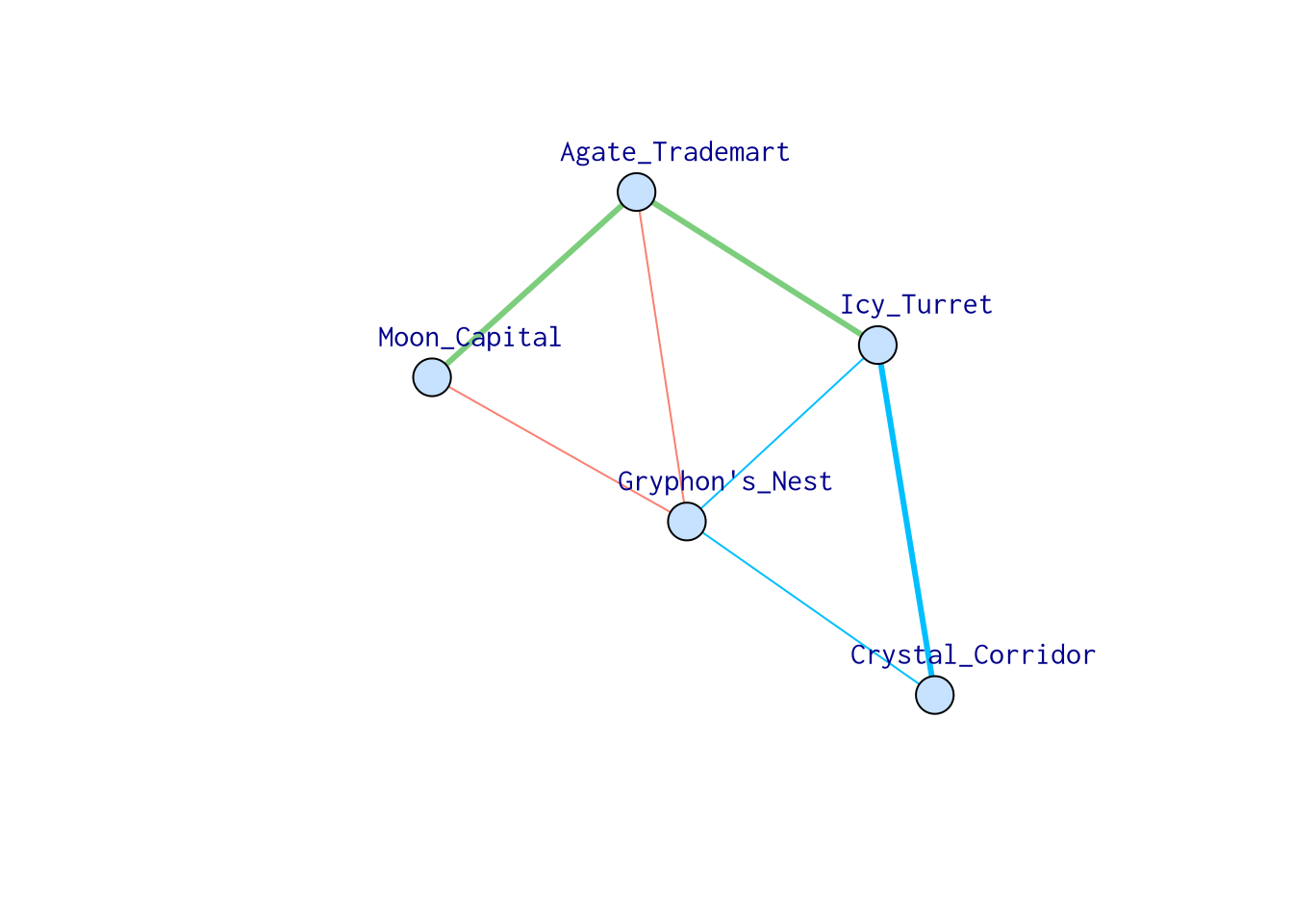 In the following network, there are many ways to go from “Moon_Capital” to “Crystal_Corridor”, but there’s only one shortest path, which is “Moon_Capital” -> “Gryphon’s_Nest” -> “Crystal_Corridor”. On the other hand, when you want to go from “Moon_Capital” to “Icy_Turret”, there are two possible ways: one through “Gryphon’s_Nest”, one through “Agate_Trademart”.