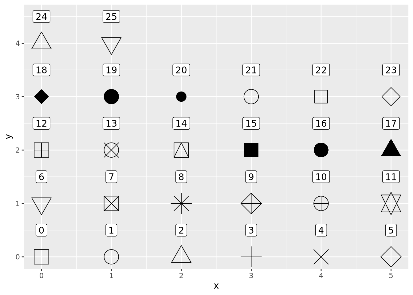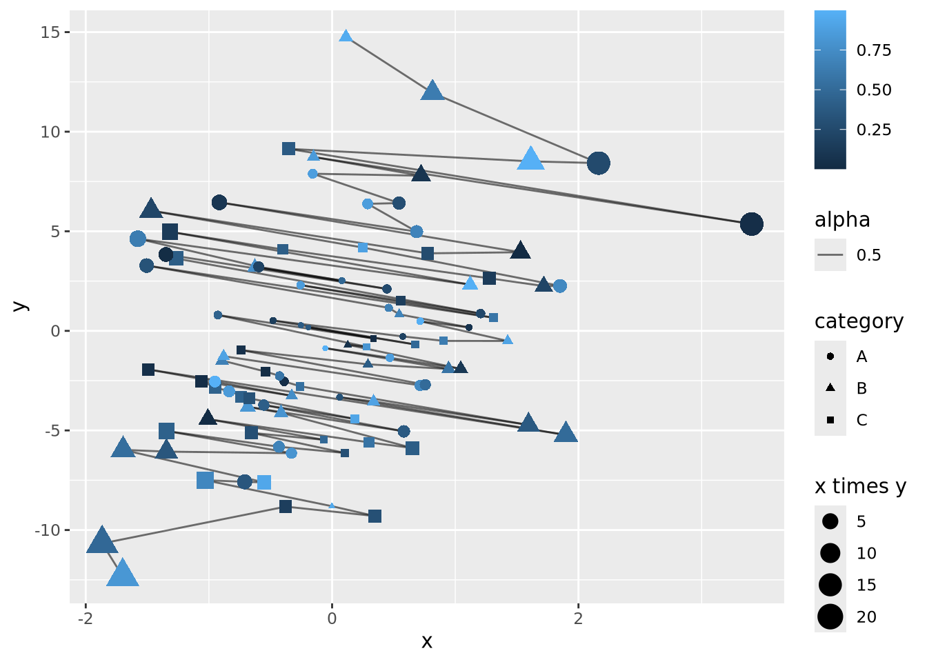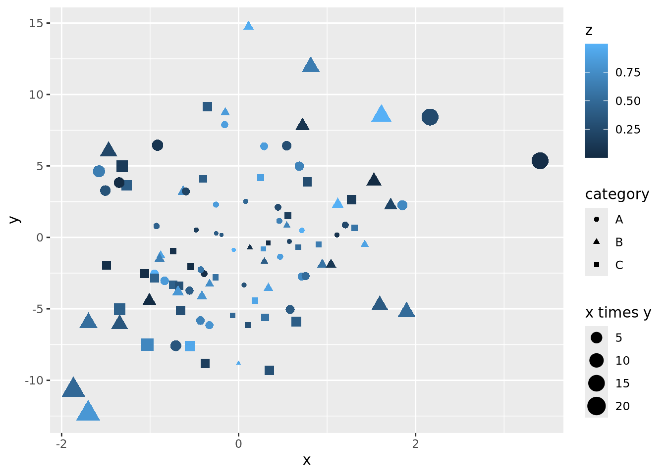 geom_point(aes(x=x, y=y, size=`x times y`, color=z, shape=category))