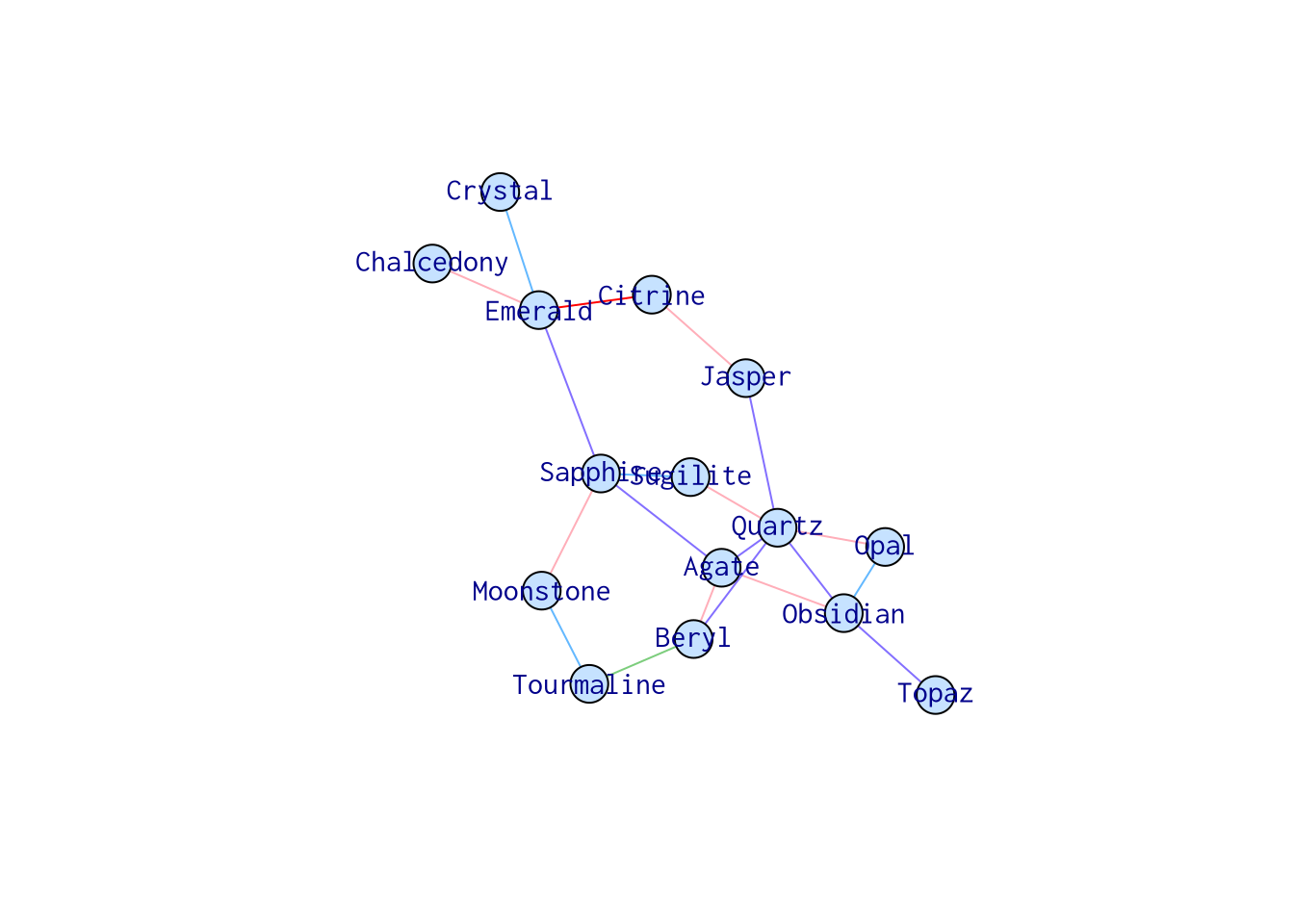 names <- c("Opal", "Tourmaline", "Emerald", "Citrine", "Jasper", "Moonstone", "Agate", "Chalcedony", "Crystal", "Obsidian", "Quartz", "Topaz", "Beryl", "Sugilite", "Sapphire")