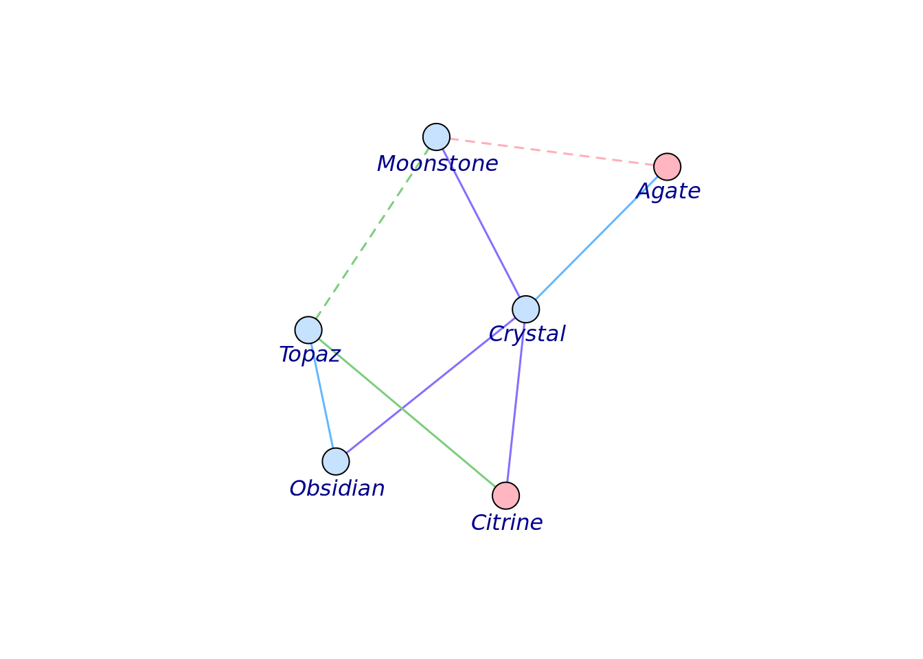 . Each row represents an edge, and the entries are vertex names. For instance, as indicated in row 1 below, there is an edge “from Crystal to Moonstone”. In an undirected graph, you can put the two vertices in either way.