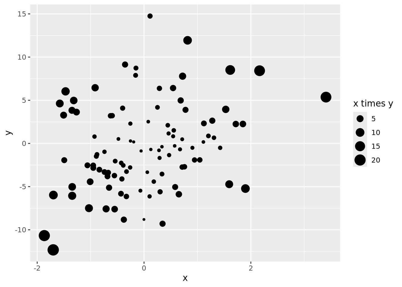 ggplot(aes(x=x,y=y,size=`x times y`)) +