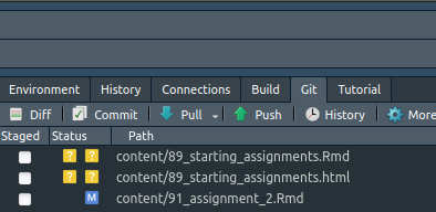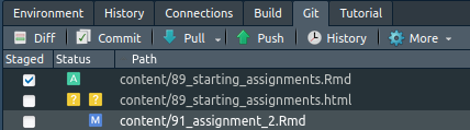 You’ll notice the files you changed are listed here, along with varying symbols. A question mark ? means the file is untracked, an M means a tracked file has been modified. A D means a tracked file has been deleted. If I select a file I want to add back to GitHub, I can tick the checkbox and it will switch to the left column. This is called staging a file.