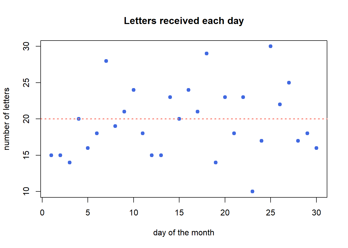 You recorded the number of letters you receive each day in a month (30 days). In the following plot, each dot represents a day. The x-axis is calender day, and y-axis is the number of letters you receive on that day. Although on average you are receiving 20 letters each day, the actual number of letters each day vary a lot.