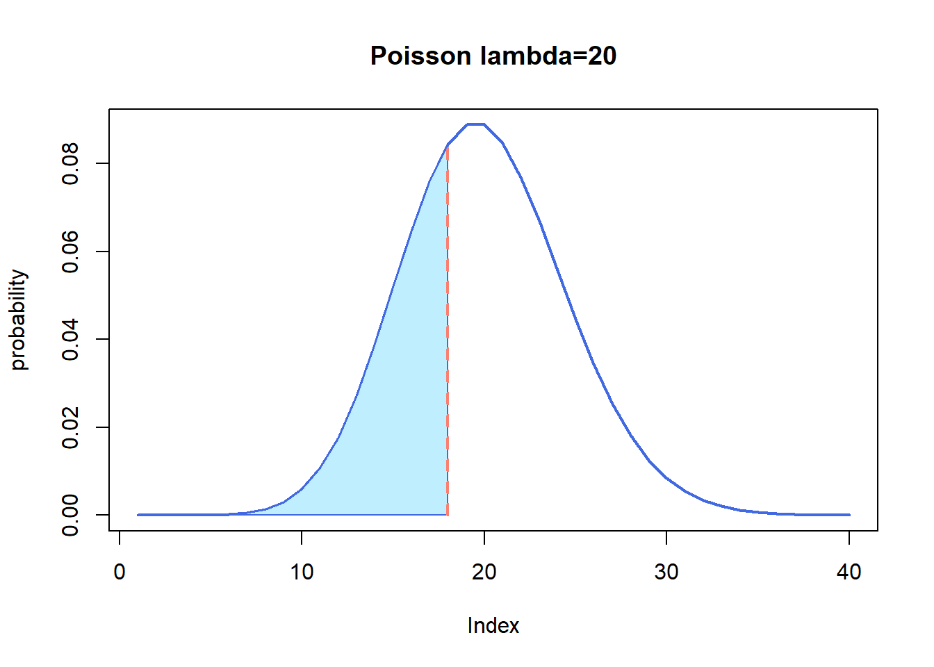 ppois(q = 18, lambda = 20, lower.tail = T)